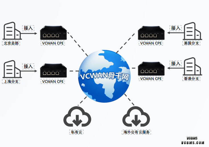 解决方案 企业总部及分支机构都接入VCWAN设备,即开即 用,网络统一管理集中配置,可视化监控,故障快 速排查;成本比传统专线降低70%以上 适用场景 国内企业组网、跨境企业全球组网
